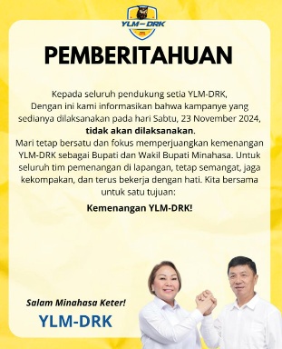Kepastian ini menyusul beredar pemberitahuan resmi dari Tim Minahasa Keter YLM–DRK yang dikirim ke grup-grup Tim Pemenangan dan Relawan Minahasa Keter sejak Jumat (22/11/2024, tadi malam.
